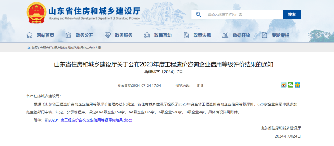 7月24日,山東省住房和城鄉(xiāng)建設廳公布了“2023年度山東省工程造價咨詢企業(yè)信用等級評價結果”,全省共有828家企業(yè)參加本次評審,我公司在此次造價咨詢企業(yè)信用等級評價中獲得最高“AAA等級”評價。