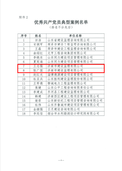 近日,山東省建設(shè)監(jiān)理與咨詢協(xié)會(huì)發(fā)布會(huì)員企業(yè)優(yōu)秀黨建成果及優(yōu)秀黨員典型案例通報(bào),我公司企業(yè)黨建成果獲評(píng)“優(yōu)秀企業(yè)黨建成果”、共產(chǎn)黨員王志強(qiáng)、張廣國的先進(jìn)事跡獲評(píng)“優(yōu)秀黨員典型案例”。